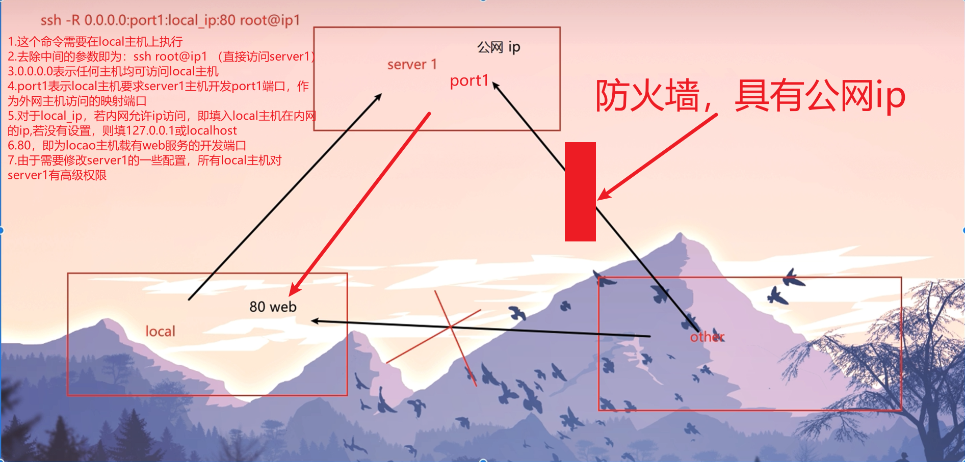 如果此时就是想访问server 1 可以修改命令为 ssh -L 80:127.0.0.1 用户@server1_ip